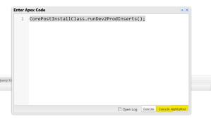 Step 3 : In Enter Apex Code window, write the following code ” CorePostInstallClass.runDev2ProdInserts(); “