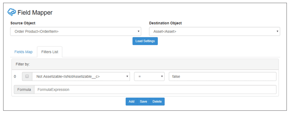 A filter that prevents the assetization of products that are not assetizable can be made using the Field Mapper. The filter, specifically, only specifies assetization when the Not Assetizable option is deselected. You can use filters to restrict source fields according to predefined criteria. Filters are all-inclusive, and formula expressions can be used to specify the conditions. The Field Mapper uses an AND statement to join the filters if a formula is not specified.