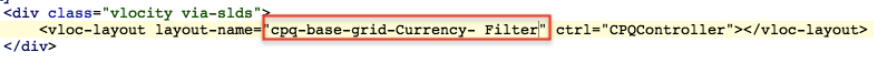 Locate the HybridCPQ page, open the page, and replace cpq-base-grid with the layout name you cloned for the currency filter to update the layout name and save it.
