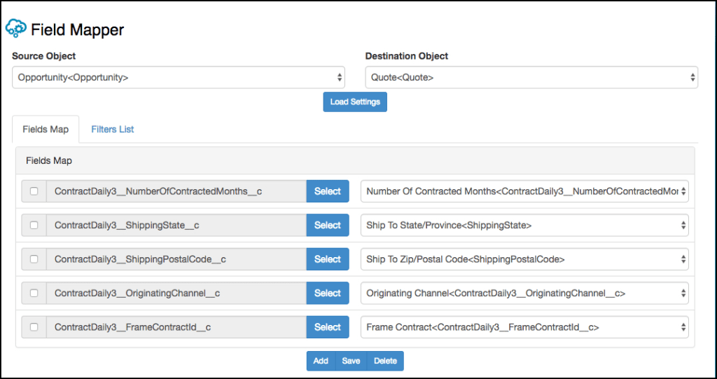 The fields on the left are from the source object, Opportunity. The fields on the right correspond to the fields in the destination object—Quote. The specific fields you see are determined by how your organisation is configured. To map a field from an opportunity to a quote, select the fields to map from the Opportunity list on the left and the field from the Quote list on the right.