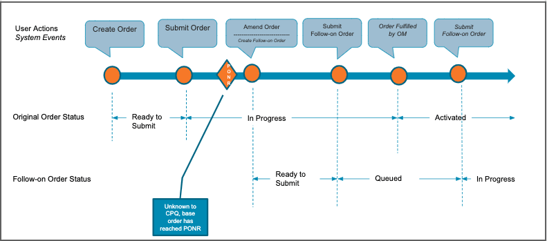 You can no longer modify an in-flight order or order items after they have passed PONR. When an order line item passes PONR, it becomes greyed out and cannot be changed. Industries CPQ generates a follow-on order in this case. A follow-on order records the changes you want to make after the original order has been fulfilled. When you place a follow-on order, it is queued in CPQ until the original order is fulfilled, at which point it is processed by Order Management.