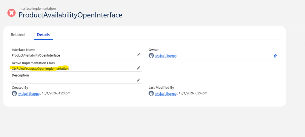 • Change the Active Implementation Class to CtxRulesProductsOpenImplementation