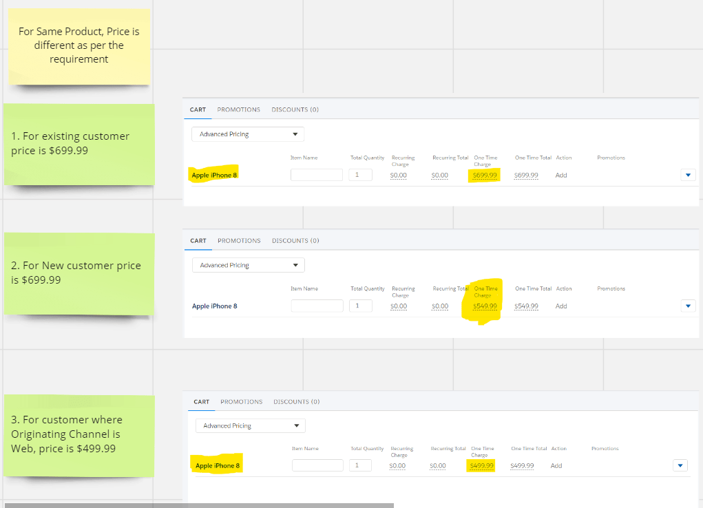 Step 8 : Now that everything is ready to test, we can do so by adding the same product to three customers: one who is already a customer, one who is a new customer with a status of “New,” and the last one whose originating channel is the web.